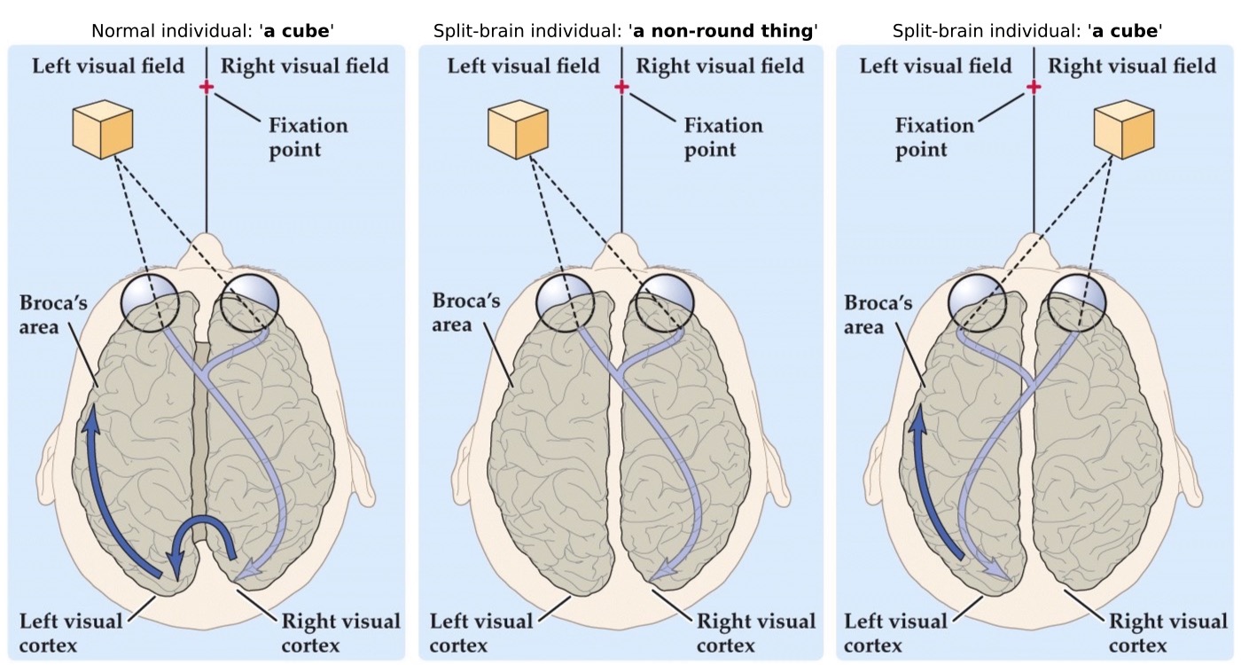 Split brain patients could not correctly name objects presented in their left visual field, presumably because that info could not reach the left hemispheres because the callosal connections were severed. But split brain patients could correctly name an object when presented in their right visual field, because that information was received by the left visual cortex and could be passed onto the language centers.