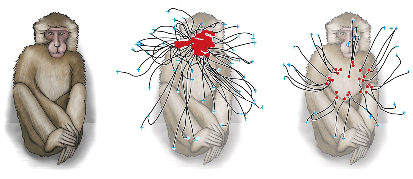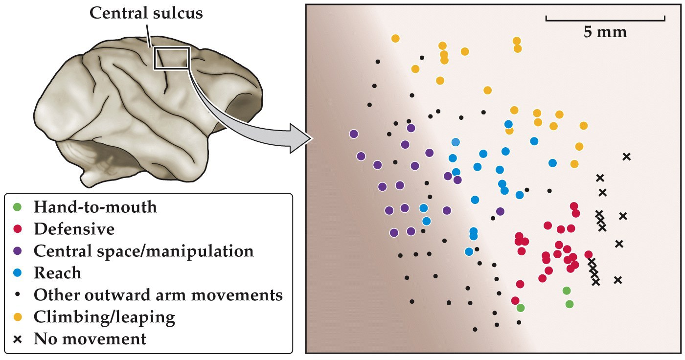Topographic distribution of microstimulation sites that evoke behavorially relevant movements in a macaque monkey.