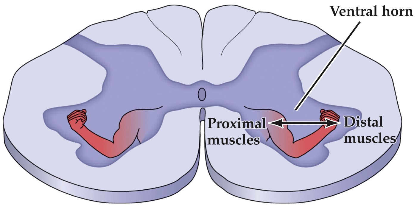 - Lateral ventral horn: motor neurons that innervate distal limb muscles
