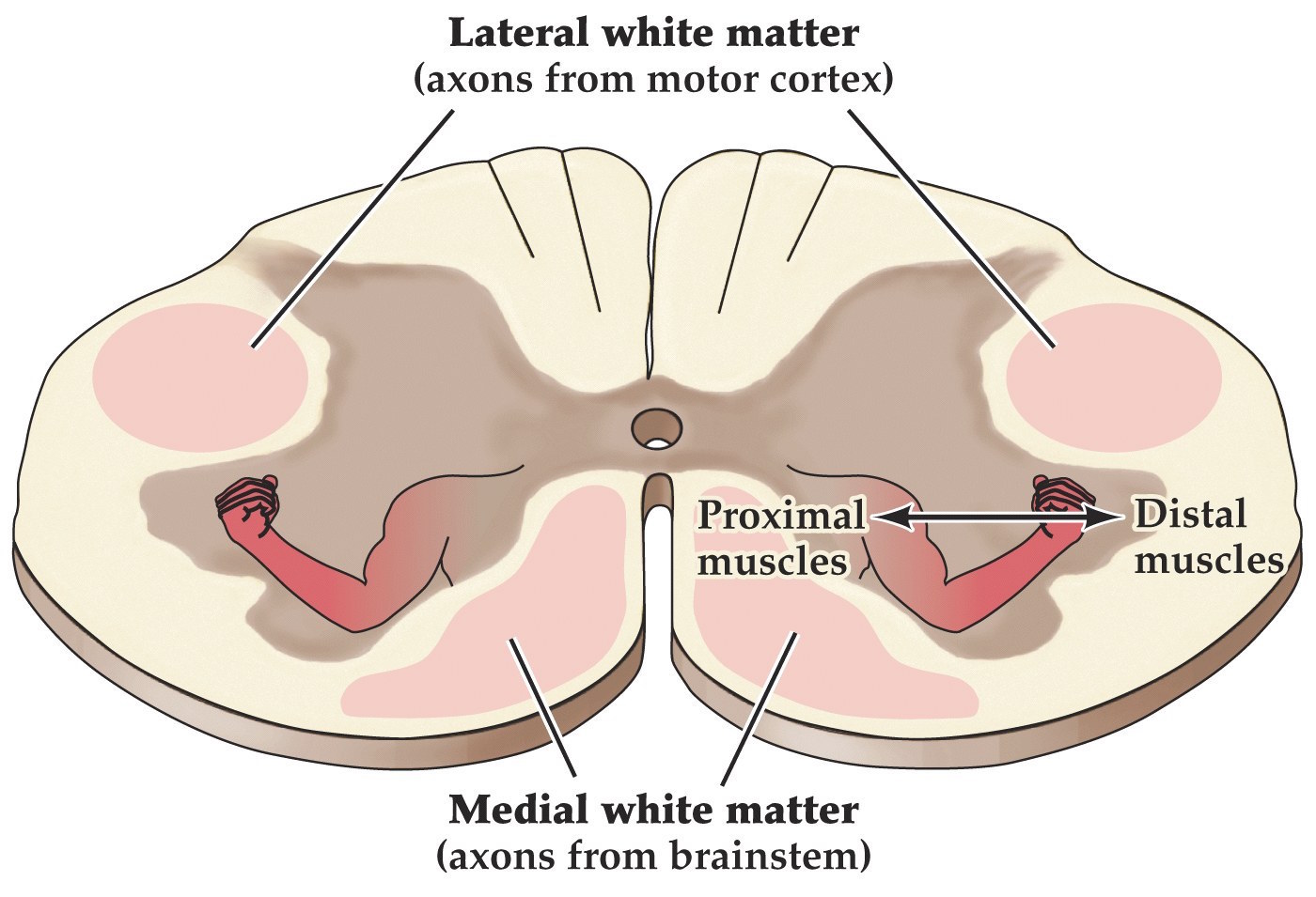 - Medial ventral horn: motor neuron pools that innervate axial muscles and proximal limb muscles
