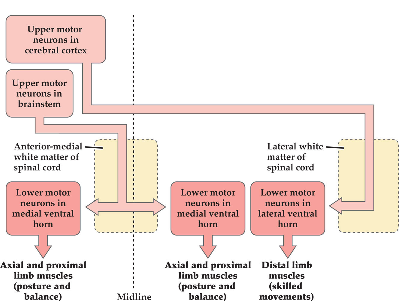 Medial ventral horn has lower motor neurons for posture, balance, and orienting movements of head and neck during shits of visual gaze. Receive descending input from the pathways originating mainly in the brainstem, course through the anterior medial white matter of the spinal cord and terminate bilaterally.
