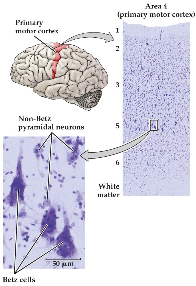 - Has 6 layers, layer V is the output layer (pyramidal cells, including the large Betz cells consisting of about 5% of projection to spinal cord and concerned with fine distal movements)