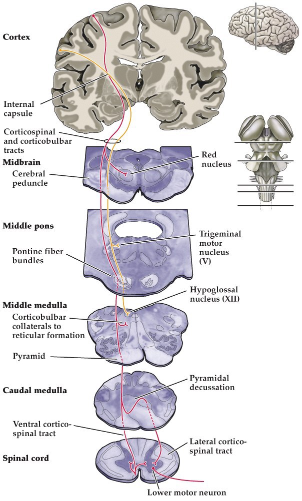 Corticobulbar is yellow, corticospinal in red. Note that most corticospinal axons cross the midline in the caudal medulla. Corticobulbar is for facial muscles.
