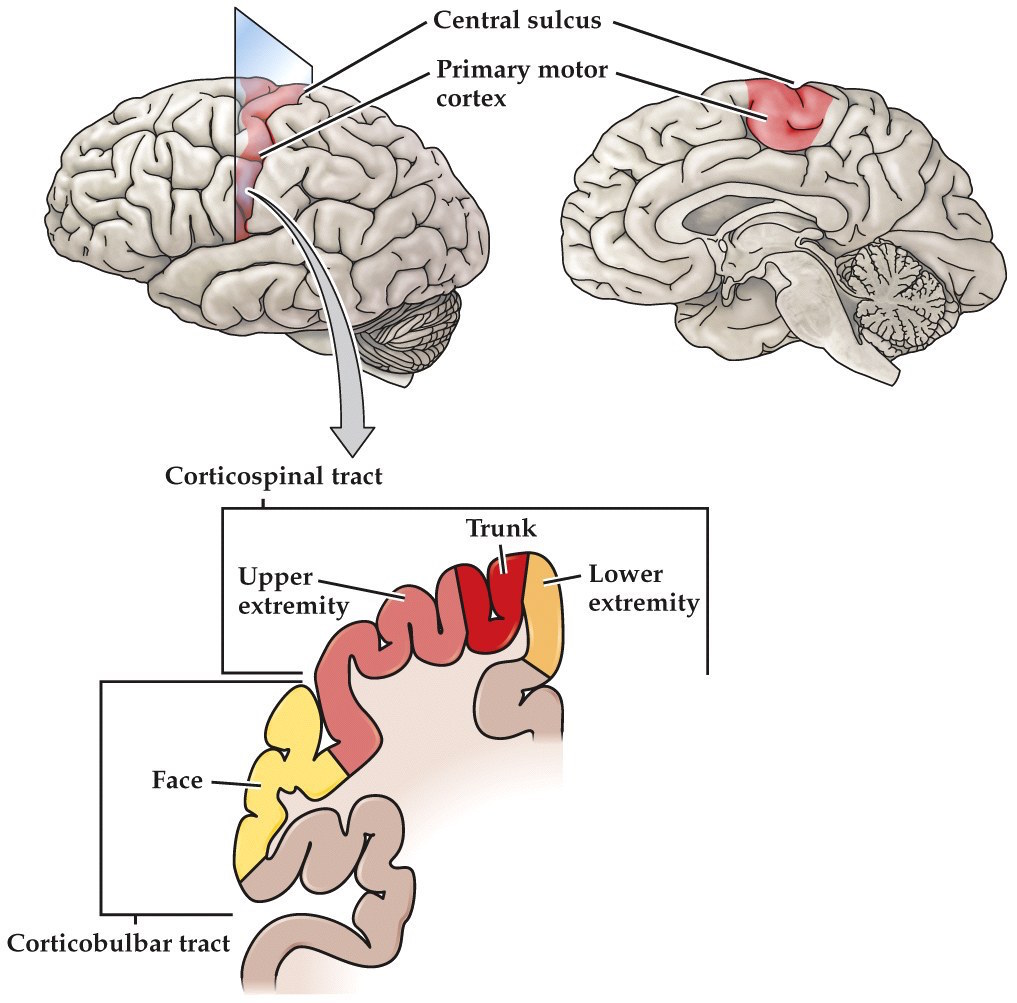 - Primary motor cortex located in the precentral gyrus