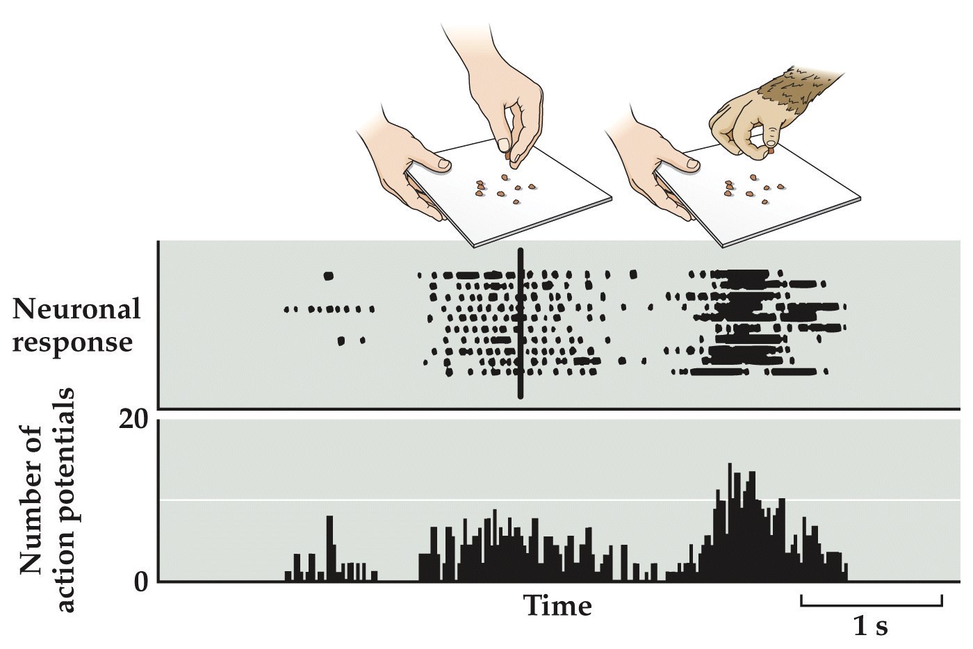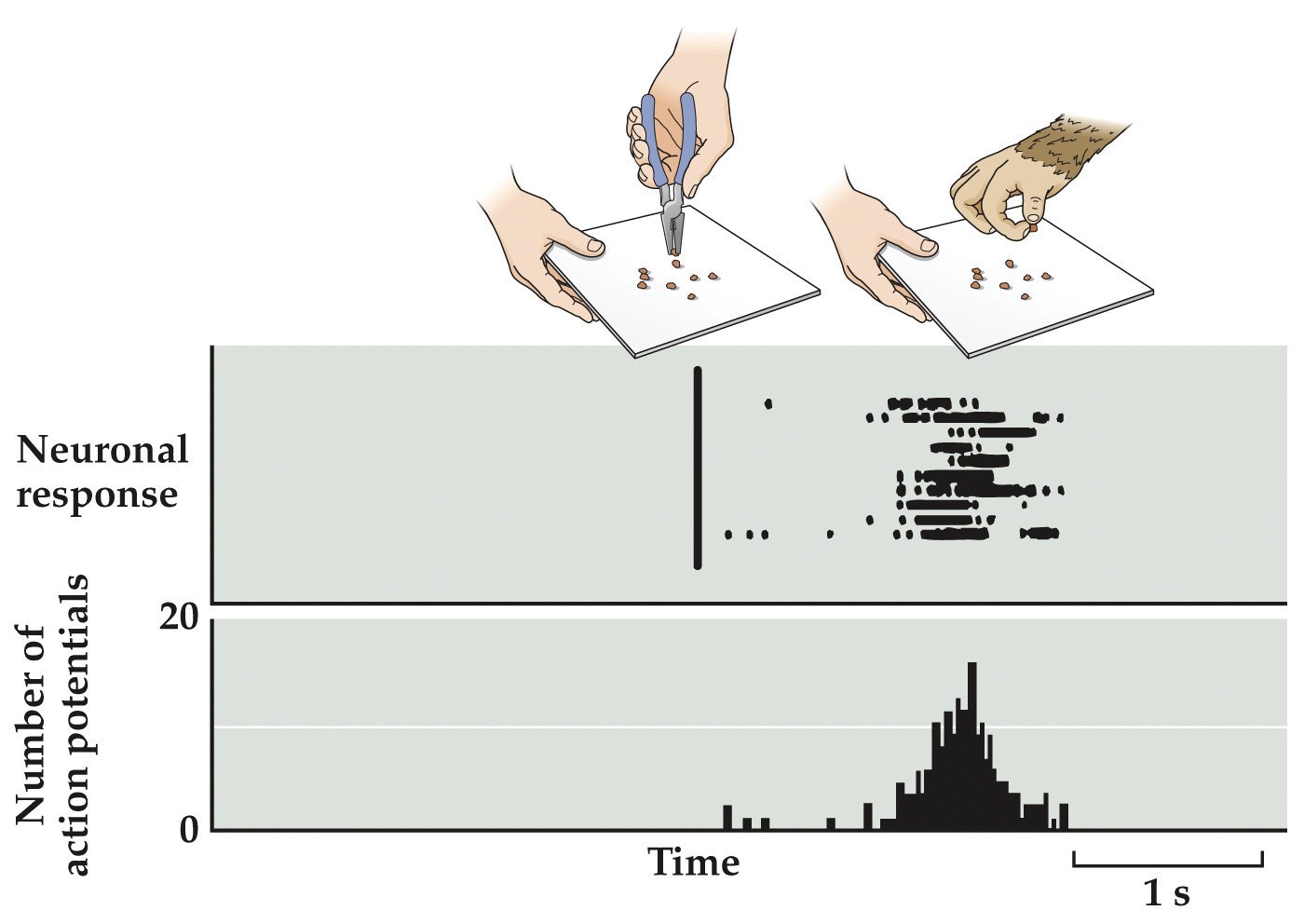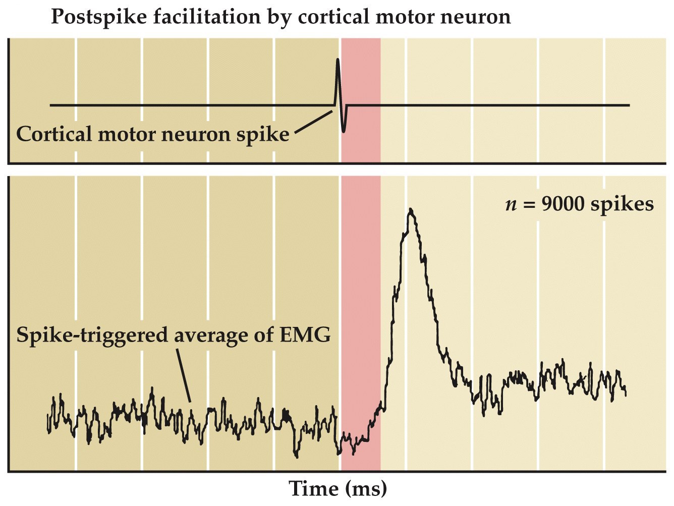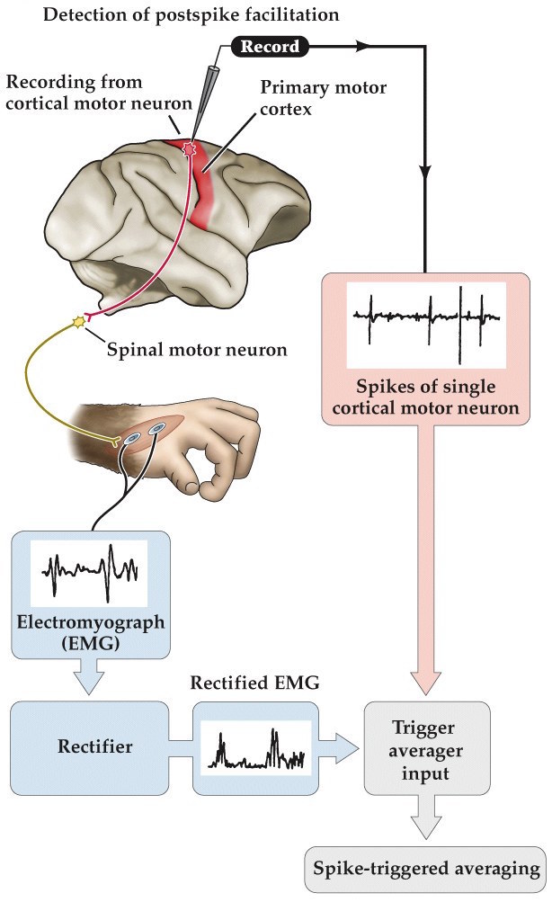 right shows the response of a thumb muscle by a fixed latency to the single spike discharge of a pyramidal tract neuron. This can be used to determine all muscles influenced by a given motor neuron.