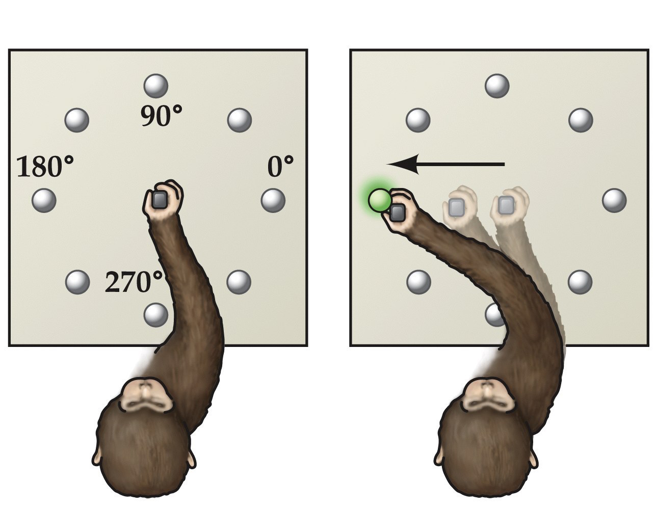- The monkey has learned the task: push the object through the hole and catch it with the other hand