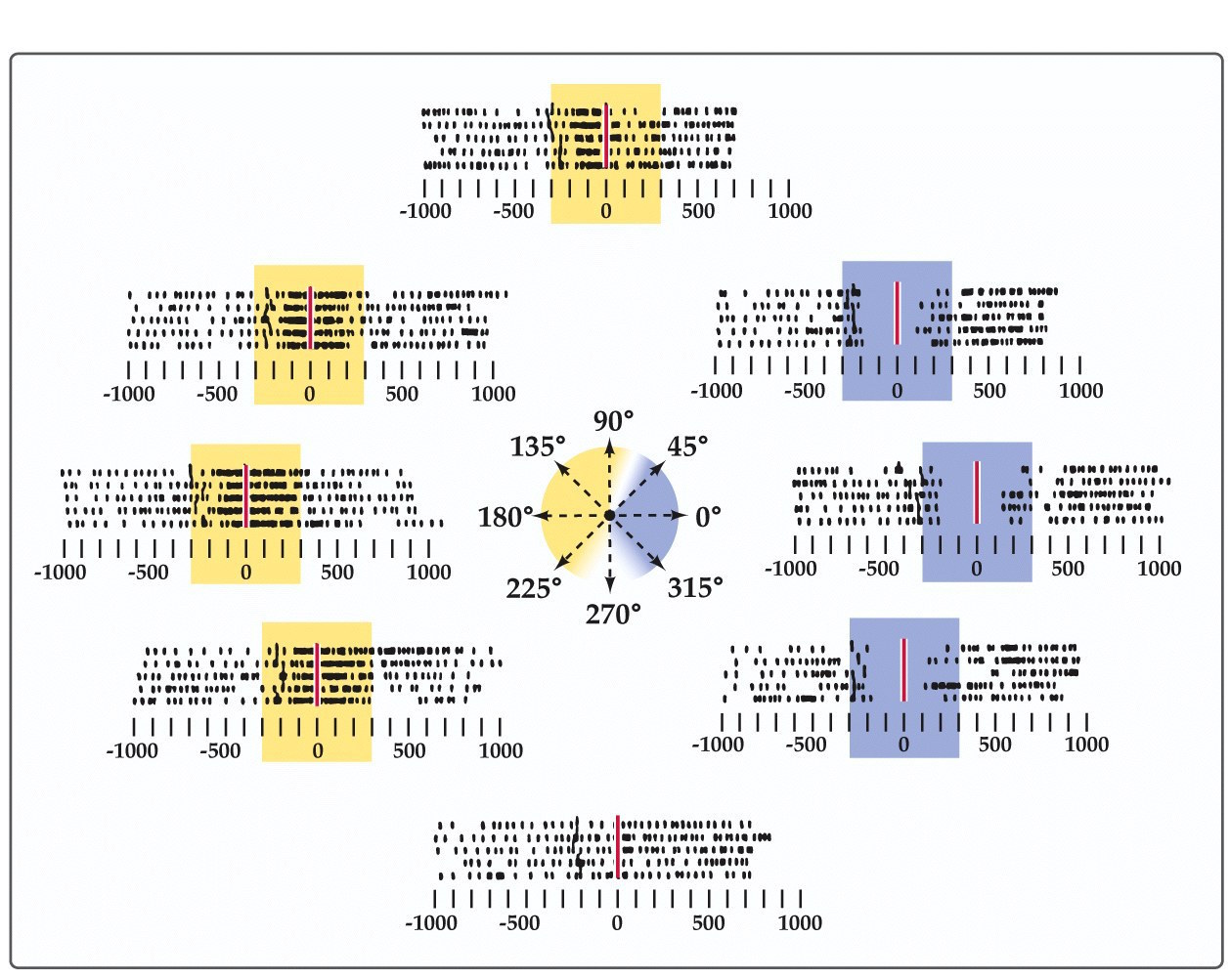raster plots, black dashes are individal spikes from one recorded neuron, 5 trials in each direction depicted