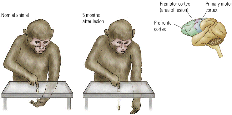 - Lesions in monkey prevent vision conditioned tasks, although vision is fine and the task can be done in other ways