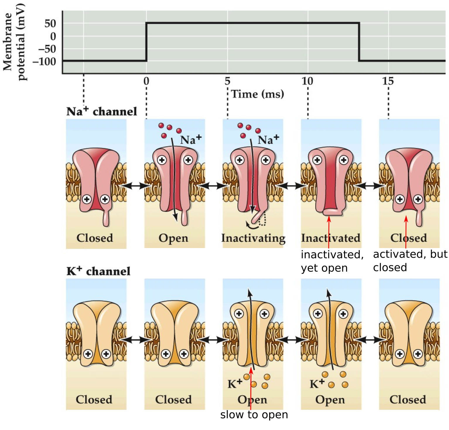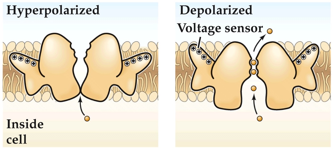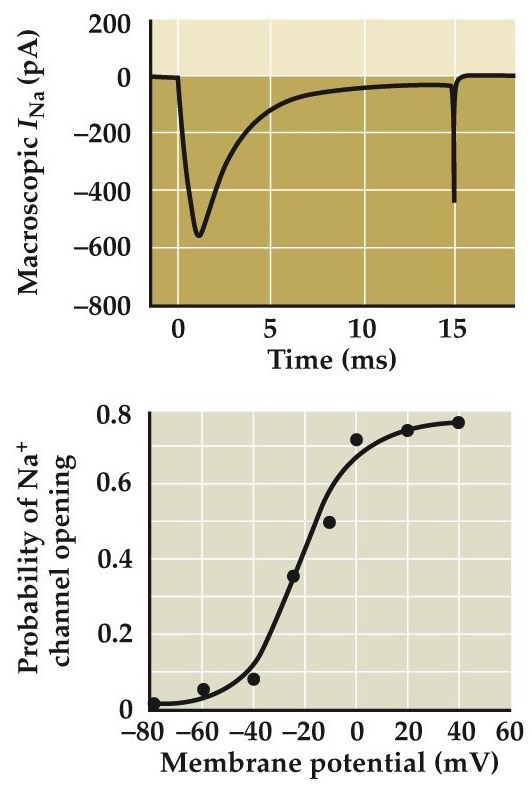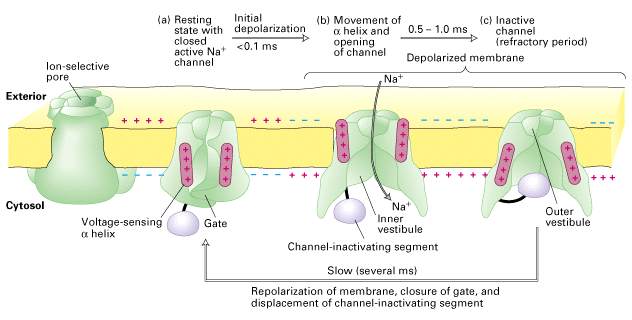 • After depolarization, the channel opens and Na⁺ ions go through. After a little bit of time (~ 1 ms) the activation gate swings shut to block channel