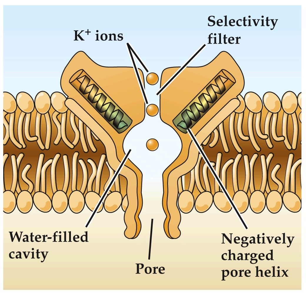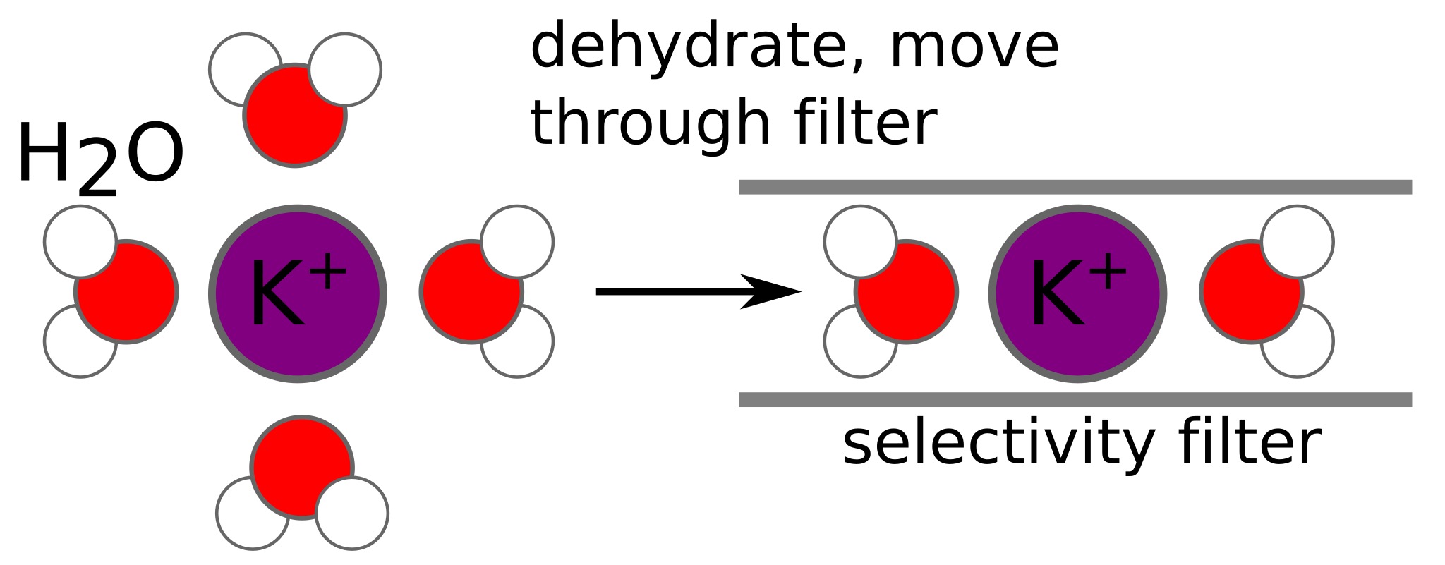 • To pass through the potassium channel, an ion must remove most of its surrounding water molecules (dehydrated)