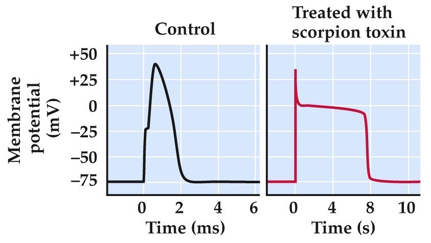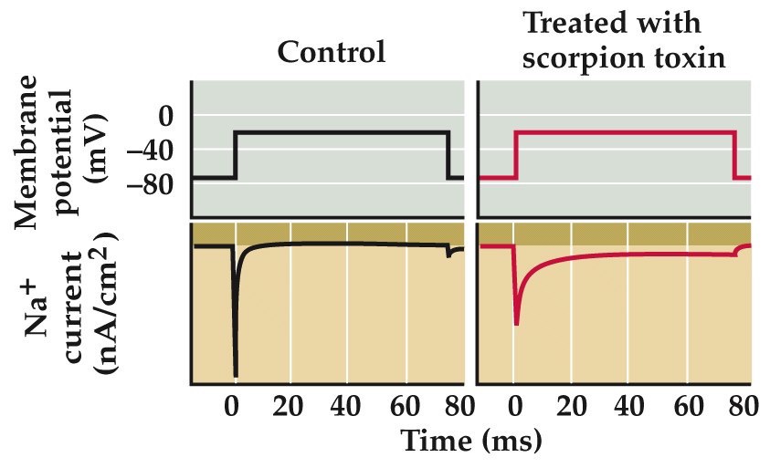 scorpions paralyse prey by injecting alpha-toxins (left panels). Slow inactivation of Na channels, prolonging the AP and messing up information flow in CNS. Beta-toxins in scorpion venom shift the voltage dependence of Na channel activation (right panel), causing Na channels to open at potential much more negative than normal inducing uncontrolled AP firing.