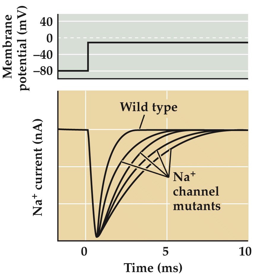 You can see the the slower inactivation kinetics in this figure here in patch clamp recordings from normal and a number of different Na channel mutants. This slowing of Na inactivation is just enough to mess up spike patterns in single neurons and elicit hyperexcitability that results in seizures in networks of connected neurons.