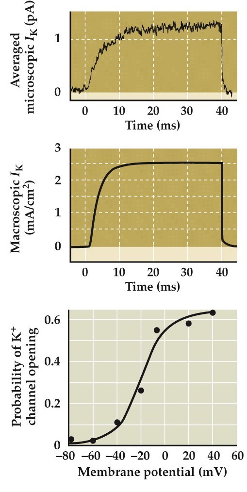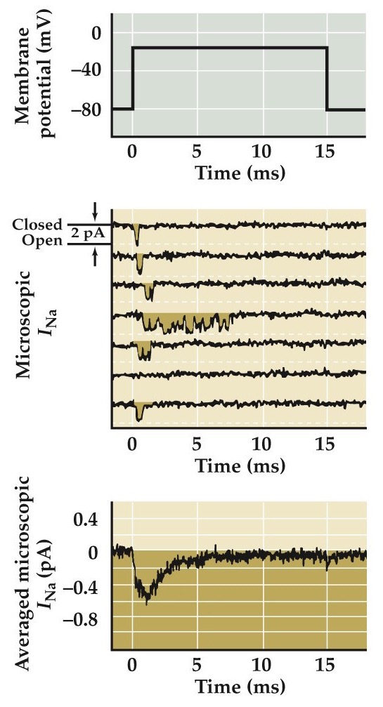 Average the microscopic currents together and you get something very similar to this macroscopic voltage-clamp current shown at the top.