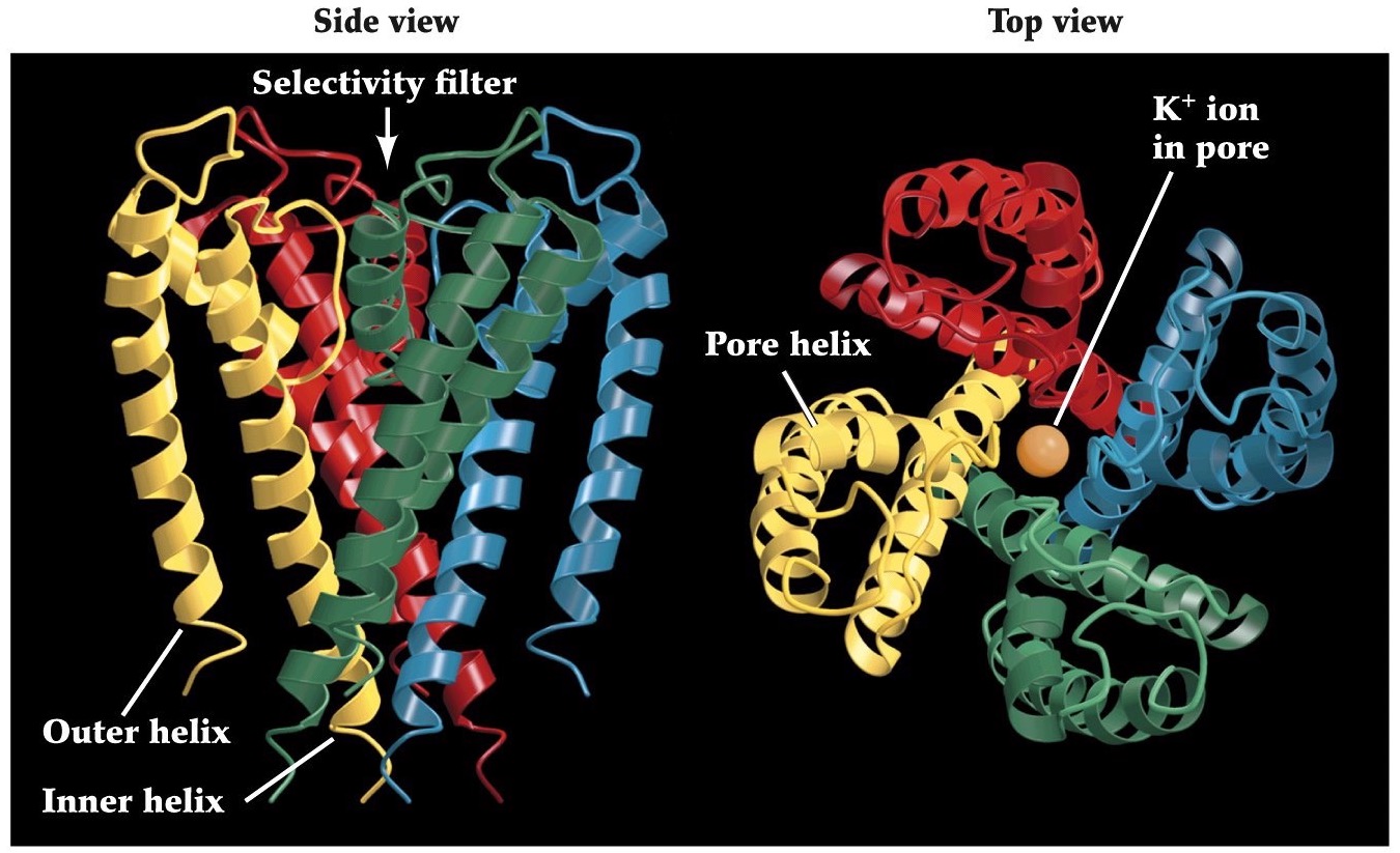 Simplified model of bacterial K channel, showing you the pore and selectivity filter.