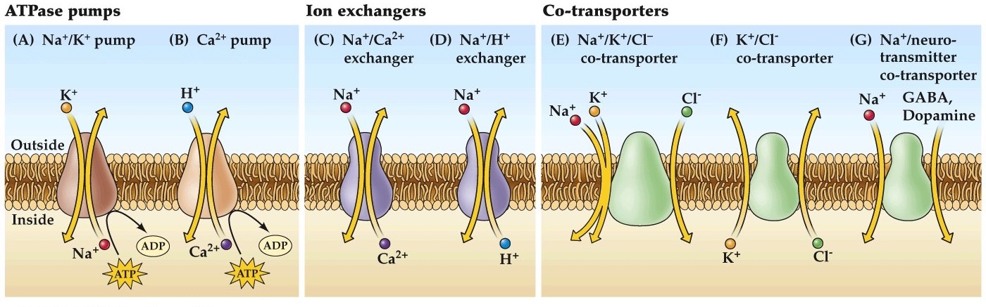 Remember these transporters are all very slow compared to ion channels, requiring several milliseconds to move a few ions compared to thousands of ions per second conducted across the membrane for an ion channel.