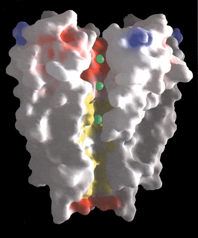 A space-filling model of the KcsA channel, showing the pore. Ions (green balls) tend to occupy three sites in the channel, two in the selectivity filter and one in a pool of water in the center of the channel.